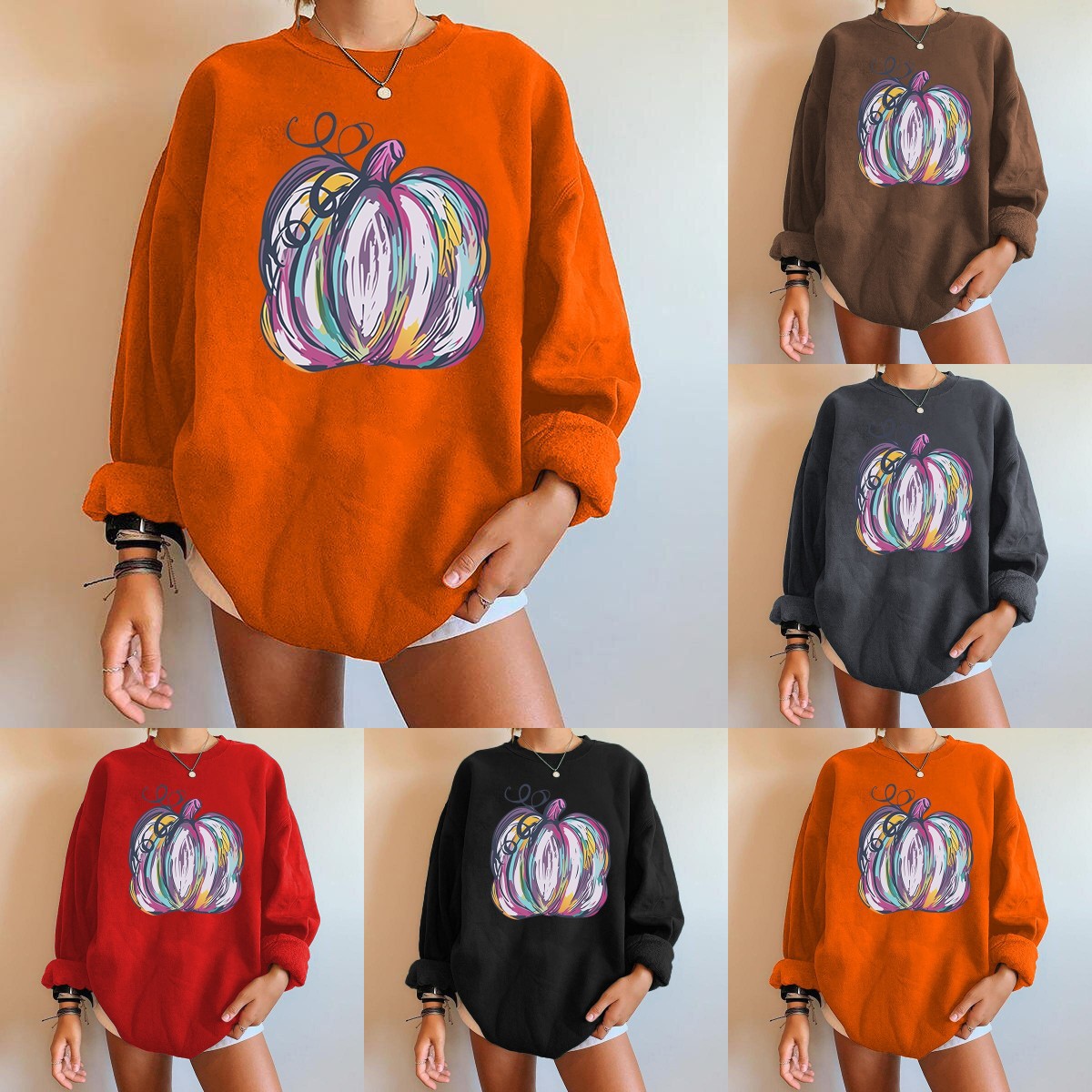 Halloween Pumpkin Letter Print Drop Shoulder Section Fleece Sweatshirt in orange with colorful pumpkin design.